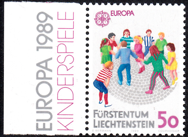 In Liechtenstein erschienen die Europamarken 1989 zum Gemeinschaftsthema " Kinderspiele" am 6. März 1989. Hier die Marke zu 50 Rappen mit der Abbildung des Spieles "Katz und Maus". Die Auflage betrug 1 152 004 Stück.