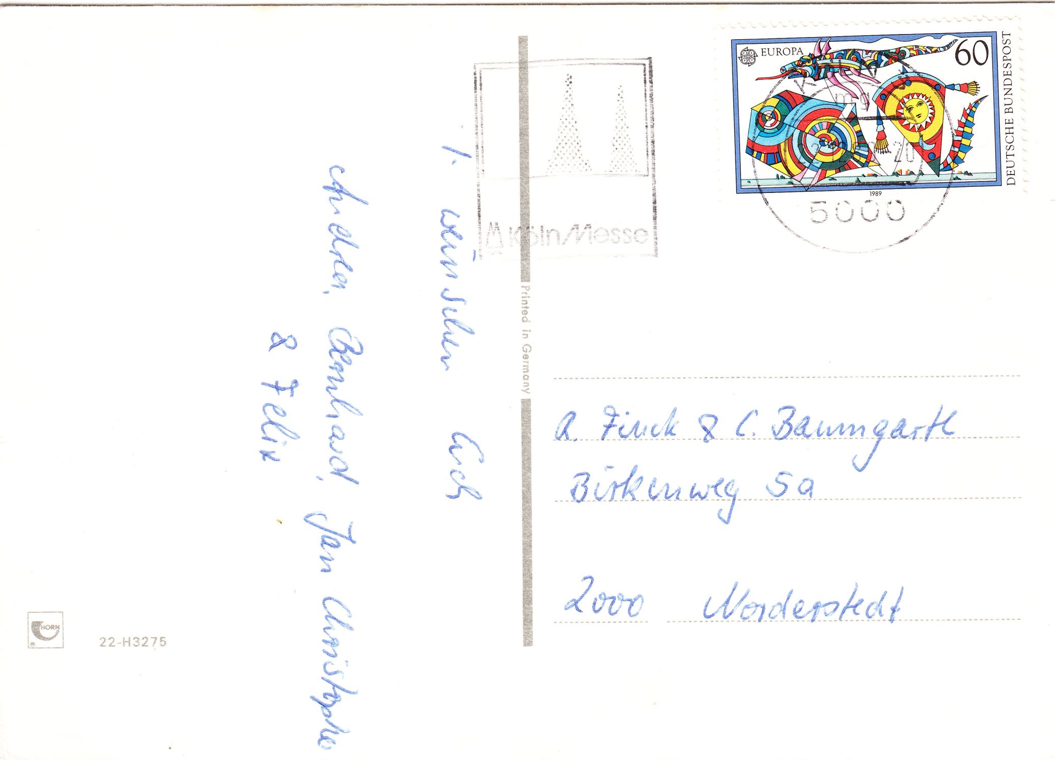 1990 erschien zur Briefmarkenmesse in Essen eine Sonderpostkarte (MiNr PSo 20) mit dem Wertzeicheneindruck der Europamarke 1989. Hier eine Karte, die 1994 als Stempelvorlage diente.