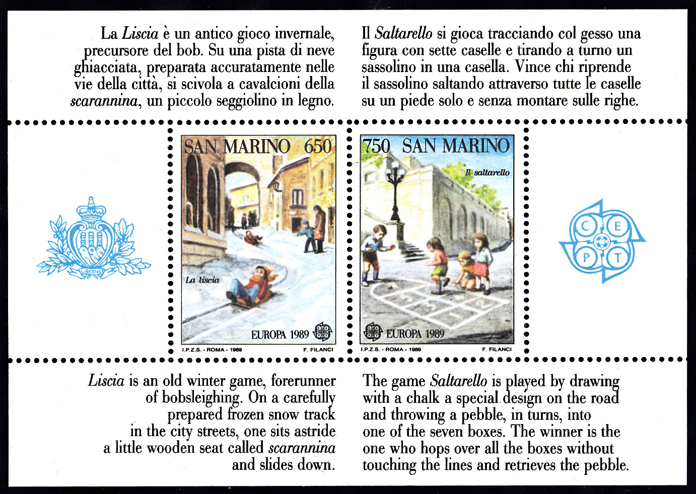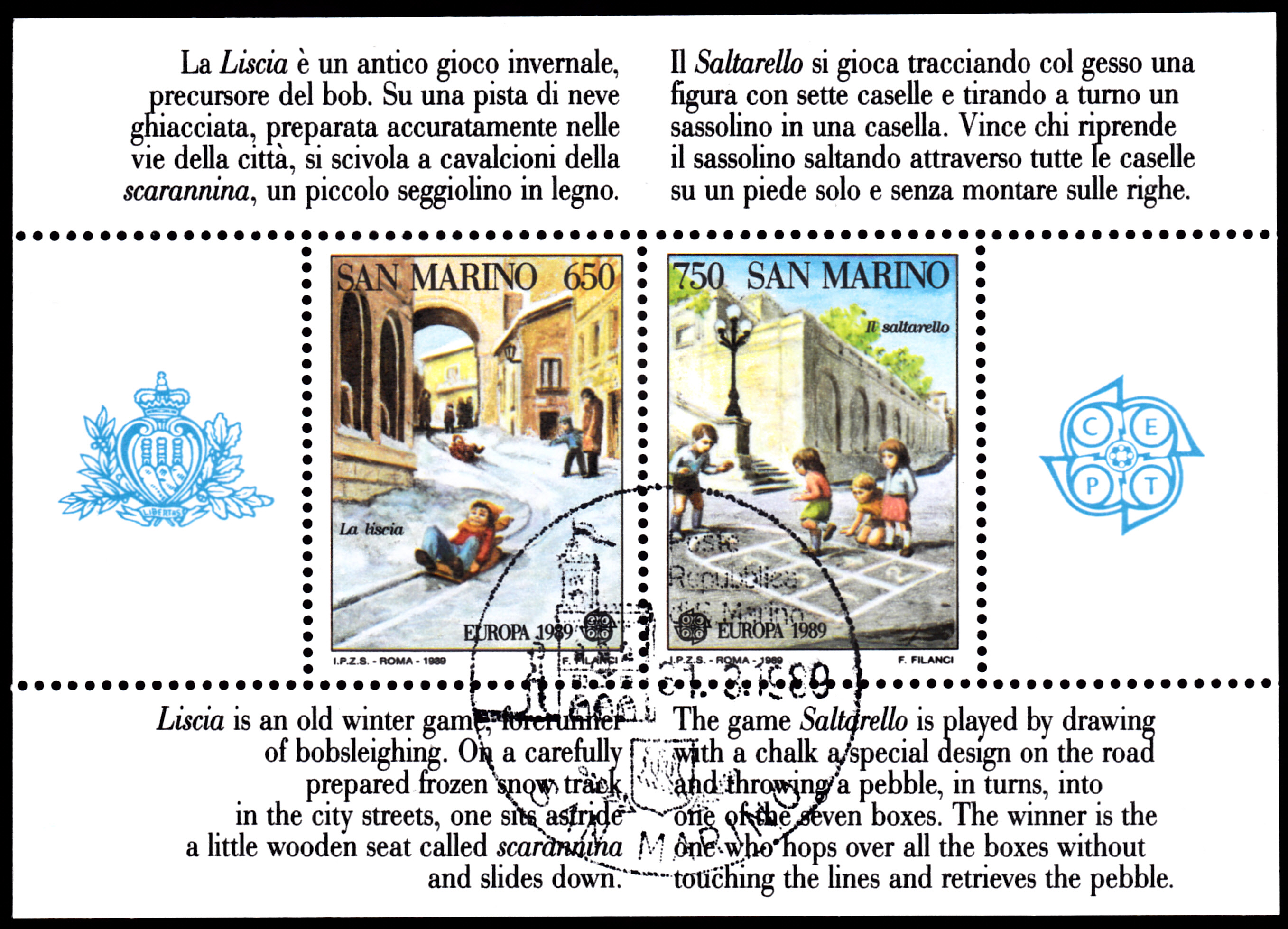 Die Europamarken 1989 zum Gemeinschaftsthema "Kinderspiele" sind in San Marino am 31. März 1989 als Block mit zwei Marken erschienen. Auf der Marke zu 650 Lire sind Kinder beim Rodeln und auf der Marke zu 750 Lire Kinder beim Hüpfspiel "Saltarello" abgebildet. Die Auflage betrug 375 000 Blocks.