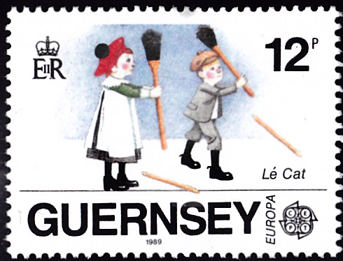 In Großbritannien-Guernsey erschienen die Europamarken 1989 zum Gemeinschaftsthema "Kinderspiele" am 28. Februar 1989. Hier die Marke zu 12 Pence mit einer Darstellung zum Kinderspiel "Lé Cat". Die Auflage der Marke betrug 839 111 Stück.
