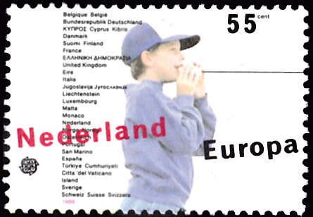 In den Niederlande erschienen die Europamarken 1989 zum Gemeinschaftsthema "Kinderspiele" am 9. Mai 1989. Hier die Marke zu 55 Cent mit einem Jungen mit Schnurtelefon und den Namen der CEPT-Länder in der jeweiligen Landessprache. Die Auflage der Marke betrug 8 462 600 Stück.
