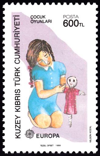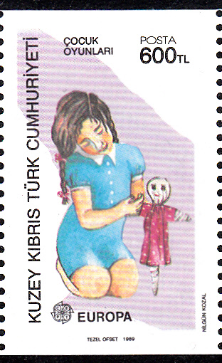 In Türkisch-Zypern erschienen die Europamarken 1989 zum Gemeinschaftsthema "Kinderspiele" am 31. Mai 1989. Die Marke zu 600 TL mit der Abbildung "Mädchen spielt mit Puppe" gibt es in zwei Varianten: A = vierseitig gez. K 12 1/4 aus dem Bogen und C = senkrecht gez. 12 1/4 aus Markenheftchen.