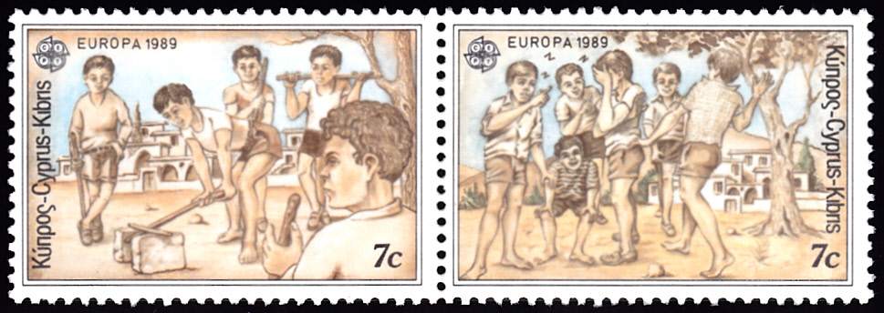 In Zypern erschienen die Europamarken 1989 zum Gemeinschaftsthema "Kinderspiele" am 8. Mai 1989. Hier die Marke zu 7 Cent mit Jungen beim Spiel "Ziziros". Die Auflage der Marke betrug 1 500 000 Stück.