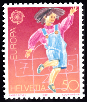 In der Schweiz erschienen die Europamarken 1989 zum Gemeinschaftsthema "Kinderspiele" am 23. Mai 1989. Hier die Marke zu 50 Rappen mit einem Kind bei einem Hüpfspiel. Die Auflage der Marke betrug 39 601 000 Stück.