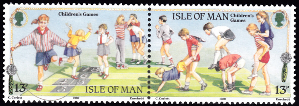 In Großbritannien-Isle of Man erschienen die Europamarken 1989 zum Gemeinschaftsthema "Kinderspiele" am 17. Mai 1989. Hier eine Marke zu 13 Pence mit spielenden Kinder im Freien.