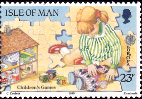 In Großbritannien-Isle of Man erschienen die Europamarken 1989 zum Gemeinschaftsthema "Kinderspiele" am 17. Mai 1989. Hier eine Marke zu 23 Pence mit spielenden Kinder im Haus.