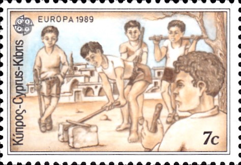 In Zypern erschienen die Europamarken 1989 zum Gemeinschaftsthema "Kinderspiele" am 8. Mai 1989. Hier die Marke zu 7 Cent mit Jungen beim Spiel "Lingri". Die Auflage der Marke betrug 1 500 000 Stück.