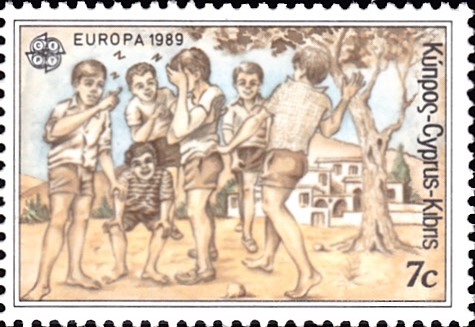 In Zypern erschienen die Europamarken 1989 zum Gemeinschaftsthema "Kinderspiele" am 8. Mai 1989. Hier die Marke zu 7 Cent mit Jungen beim Spiel "Ziziros". Die Auflage der Marke betrug 1 500 000 Stück.