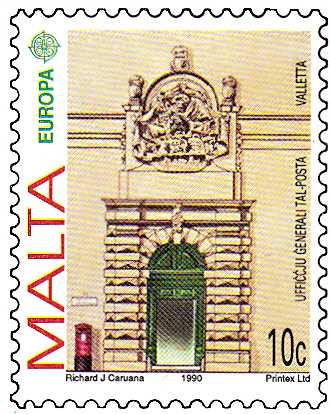 Die Europamarken 1990 sind in Malta zum Gemeinschaftsthema "Postalische Einrichtungen" am 9. Februar 1990 erschienen. Hier die Marke zu 10 Cent mit der Abbildung des Portals des Hauptpostamtes in Valetta.