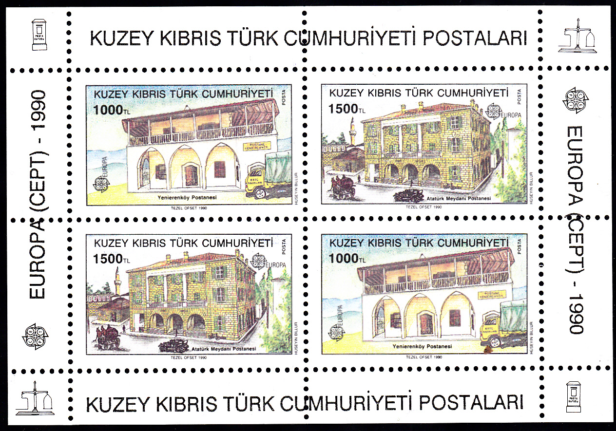 Die Europamarken 1990 aus Türkisch-Zypern zum Gemeinschaftsthema "Postalische Einrichtungen" sind am 31. Mai 1990 auch in einem Block mit jeweils zwei der Marken MiNr 273 mit der Abbildung des Postamtes Yenierenköy und MiNr 274 mit dem Postamt am Atatürk-Platz in Lefkosa (Nikosia) erschienen. Die Auflage des Blockes betrug 75 000 Stück. Hier ein postfrisches Exemplar.