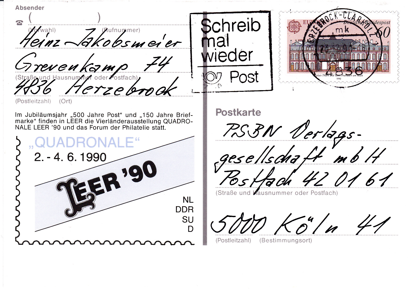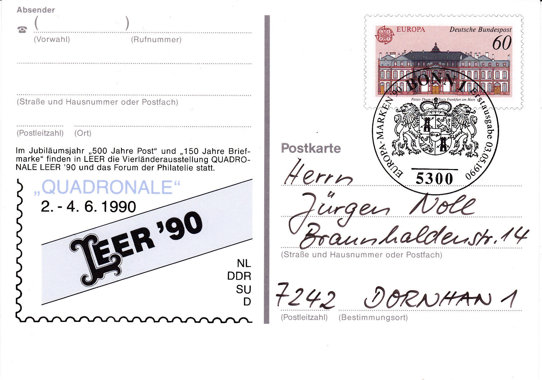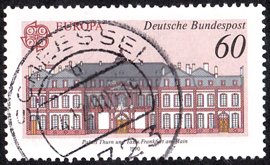 Bei der Deutschen Bundespost sind die Europamarken 1990 zum Gemeinschaftsthema "Postalische Einrichtungen" am 3.5.1990 erschienen. Hier die Marke zu 60 Pf mit dem Palais Thurn und Taxis in Frankfurt am Main. Die Marke erschien in einer Auflage von 63 400 000 Stück.
