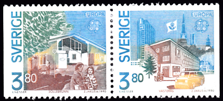 Die Europamarken 1990 sind in Schweden zum Gemeinschaftsthema "Postalische Einrichtungen" am 28. März 1990 erschienen. Hier die Marke zu 3,80 Kronen mit der Abbildung des Postamtes in Västerås. Die Auflage der Marke betrug 3 870 000 Stück.