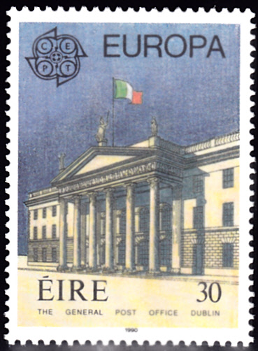 Die Europamarken 1990 sind in Irland zum Gemeinschaftsthema "Postalische Einrichtungen" am 3. Mai 1990 erschienen. Hier die Marke zu 30 Pence mit der Abbildung des Hauptpostamtes in Dublin.