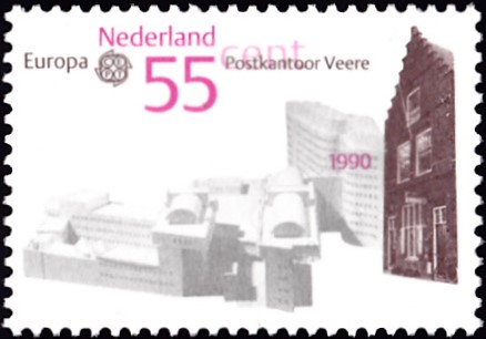 Die Europamarken 1990 sind in den Niederlande zum Gemeinschaftsthema "Postalische Einrichtungen" am 12. Juni 1990 erschienen. Hier die Marke zu 55 Cent mit der Abbildung des Postamtes Veere (rechts) und der Hauptgeschäftsstelle der Königlichen PTT Nederland N.V. in Groningen (links nur in Grautönen). Die Auflage der Marke betrug 10 658 750 Stück.