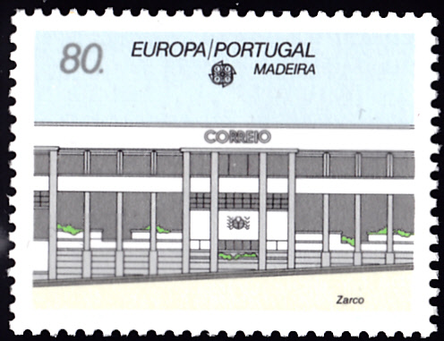 Die Europamarken 1990 sind in Portugal Madeira zum Gemeinschaftsthema "Postalische Einrichtungen" am 11. April 1990 erschienen. Hier eine Marke zu 80 Escudo mit der Abbildung des Postamtes Zarco. Die Auflage der Marke betrug 600 000 Stück.