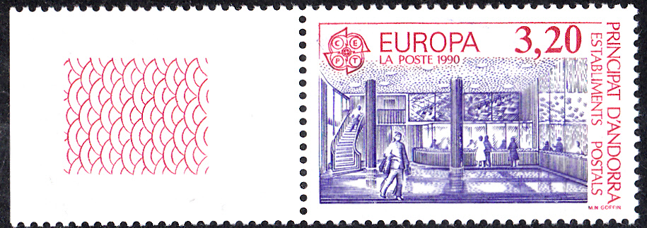 Die Europamarken 1990 der französischen Post in Andorra zum Gemeinschaftsthema "Postalische Einrichtungen" sind am 5. Mai 1990 erschienen. Hier die Marke zu 3,20 Franc mit der Abbildung der Schalterhalle des neuen Gebäudes der französischen Post in Andorra la Vella (seit 1990). Die Auflage der Marke betrug 269 079 Stück.