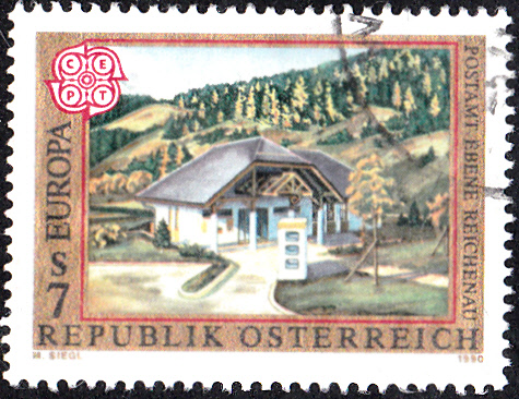 Die Europamarken 1990 sind in Österreich zum Gemeinschaftsthema "Postalische Einrichtungen" am 4. Mai 1990 erschienen. Hier diese Marke zu 7 Schilling mit der Abbildung des Postamtes Ebene Reichenau. Die Auflage der Marke betrug 3 700 000 Stück.
