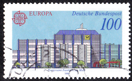 Bei der Deutschen Bundespost sind die Europamarken 1990 zum Gemeinschaftsthema "Postalische Einrichtungen" am 3.5.1990 erschienen. Hier die Marke zu 100 Pf mit dem Postgiroamt Frankfurt am Main. Die Marke erschien in einer Auflage von 71 310 000 Stück.