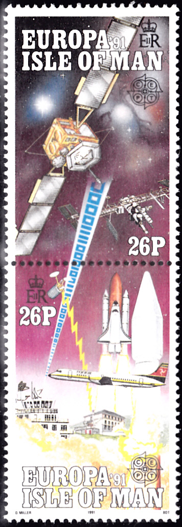 In Großbritannien-Isle of Man erschienen die Europamarken 1991 zum Gemeinschaftsthema "Europäische Weltraumfahrt" am 24. April 1991. Hier eine Marke zu 26 Pence mit einem Flughafen- und Rundfunkgebäude, einem Flugzeug und einer Raumfähre beim Start.