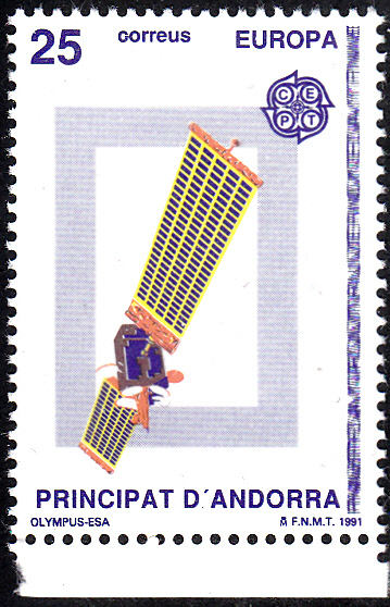Die Europamarken 1991 der spanischen Post in Andorra zum Gemeinschaftsthema "Europäische Weltraumfahrt" sind am 10. Mai 1991 erschienen und zeigen als Motiv den Fernmeldesatellit "Olympus". Hier die Marke zu 25 Pesetas, der in einer Auflage von 650 000 Stück erschien.