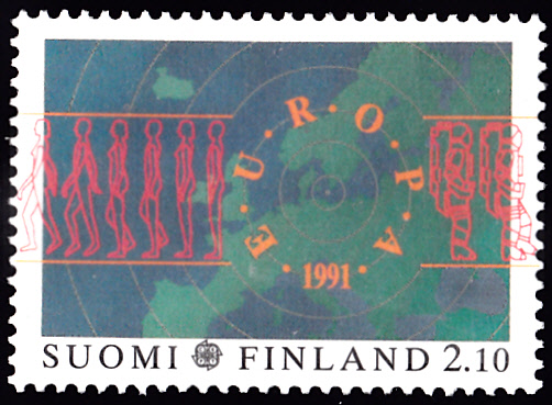 In Finnland erschienen die Europamarken 1991 zum Gemeinschaftsthema "Europäische Weltraumfahrt" am 7. Juni 1991. Hier die Marke zu 2,10 Mark mit der Abbildung Menschen mit und ohne Raumanzug vor einer Europakarte. Die Auflage betrug 6 000 000 Stück.