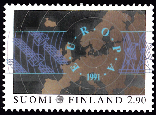 In Finnland erschienen die Europamarken 1991 zum Gemeinschaftsthema "Europäische Weltraumfahrt" am 7. Juni 1991. Hier die Marke zu 2,90 Mark mit der Abbildung Satelliten und Empfangsantennen vor einer Europakarte. Die Auflage betrug 3 000 000 Stück.