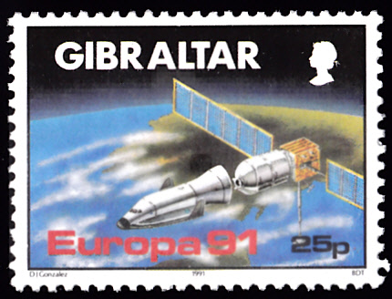In Gibraltar erschienen die Europamarken 1991 zum Gemeinschaftsthema "Europäische Weltraumfahrt" am 26. Februar 1991. Hier die Marke zu 25 Pence mit der Abbildung der Raumfähre "Hermes" mit der Raumstation "Columbus".