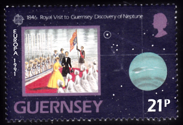 In Großbritannien-Guernsey erschienen die Europamarken 1991 zum Gemeinschaftsthema "Europäische Weltraumfahrt" am 30. April 1991. Hier eine Marke zu 21 Pence mit einer Abbildung zu einem Besuch von Königin Viktoria auf Guernsey und zur Entdeckung des Planeten Neptun im Jahre 1846. Die Auflage betrug 390 924 Stück.