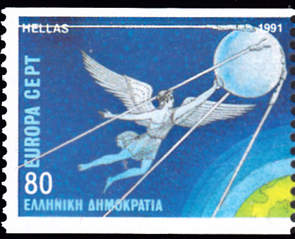 Die Europamarken 1991 sind in Griechenland zum Gemeinschaftsthema "Europäische Weltraumfahrt" am 20. Mai 1991 erschienen. Die Marken gibt es in zwei Zähnungen: A = vierseitig gez. K 12 1/2 und C = senkrecht gez. 12 1/2. Hier eine Marke zu 80 Drachmen aus dem Heftchen (MiNr 1777 C) mit der Abbildung von Ikarus und dem ersten Satellit "Sputnik 1". Die Auflage dieser Marke betrug 200 000 Stück.