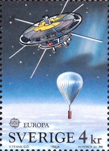 In Schweden erschienen die Europamarken 1991 zum Gemeinschaftsthema "Europäische Weltraumfahrt" am 15. Mai 1991. Hier eine Marke zu 4 Kronen mit der Abbildung des Schwedischen Forschungssatelliten "Freja" und einem Wetterballon. Die Marke ist in einem Markenheftchen mit der Auflage von 283 000 Heftchen erschienen.