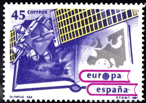 In Spanien erschienen die Europamarken 1991 zum Gemeinschaftsthema "Europäische Weltraumfahrt" am 28. Mai 1991. Hier die Marke zu 45 Pesetas mit der Abbildung des Fernmeldesatelliten "Olympus". Die Auflage dieser Marke betrug 10 000 000 Stück.