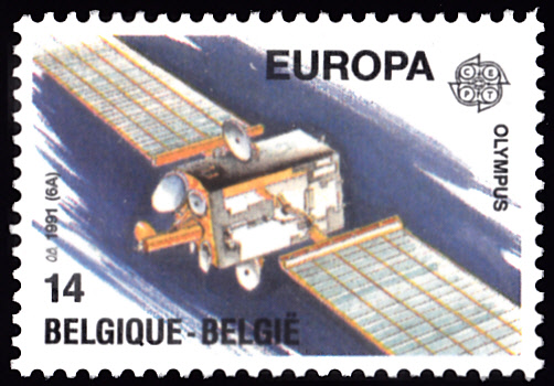 In Belgien erschienen die Europamarken 1991 zum Gemeinschaftsthema "Europäische Weltraumfahrt" am 4. Mai 1991. Hier die Marke zu 14 Franc mit der Abbildung des Fernmeldesatelliten "Olympus". Die Auflage betrug 7 500 000 Stück.