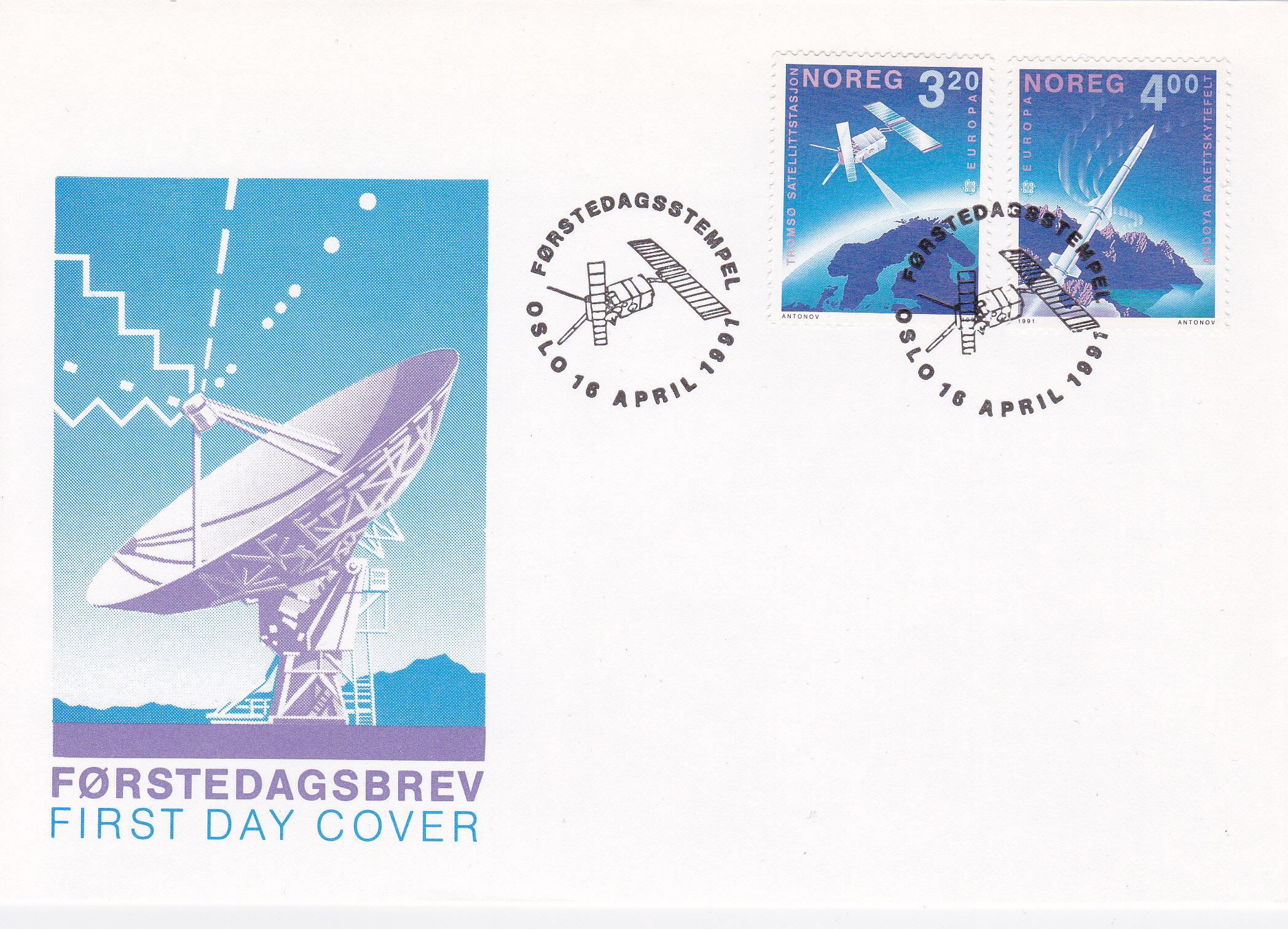 In Norwegen erschienen die Europamarken 1991 zum Gemeinschaftsthema "Europäische Weltraumfahrt" am 16. April 1991. Hier die Marke zu 3,20 Kronen mit dem Erdbeobachtungssatellit "ERS-1" über Skandinavien. Die Auflage betrug 6 636 998 Stück.