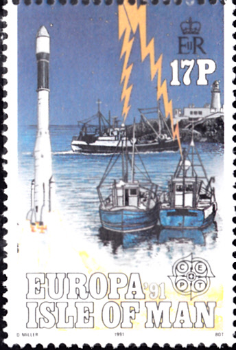 In Großbritannien-Isle of Man erschienen die Europamarken 1991 zum Gemeinschaftsthema "Europäische Weltraumfahrt" am 24. April 1991. Hier eine Marke zu 17 Pence mit einer Startende Ariane-Rakete und Fischerboote im Hafen von Douglas.