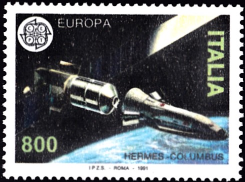 In Italien erschienen die Europamarken 1991 zum Gemeinschaftsthema "Europäische Weltraumfahrt" am 29. April 1991. Hier die Marke zu 800 Lire mit der Raumfähre "Hermes" und der Raumstation "Columbus". Die Auflage dieser Marke betrug 4 000 000 Stück.