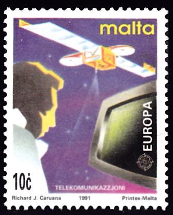 Auf Malta erschienen die Europamarken 1991 zum Gemeinschaftsthema "Europäische Weltraumfahrt" am 16. März 1991. Hier die Marke zu 10 Cent mit der Abbildung des Fernmeldesatelliten "Eurostar".