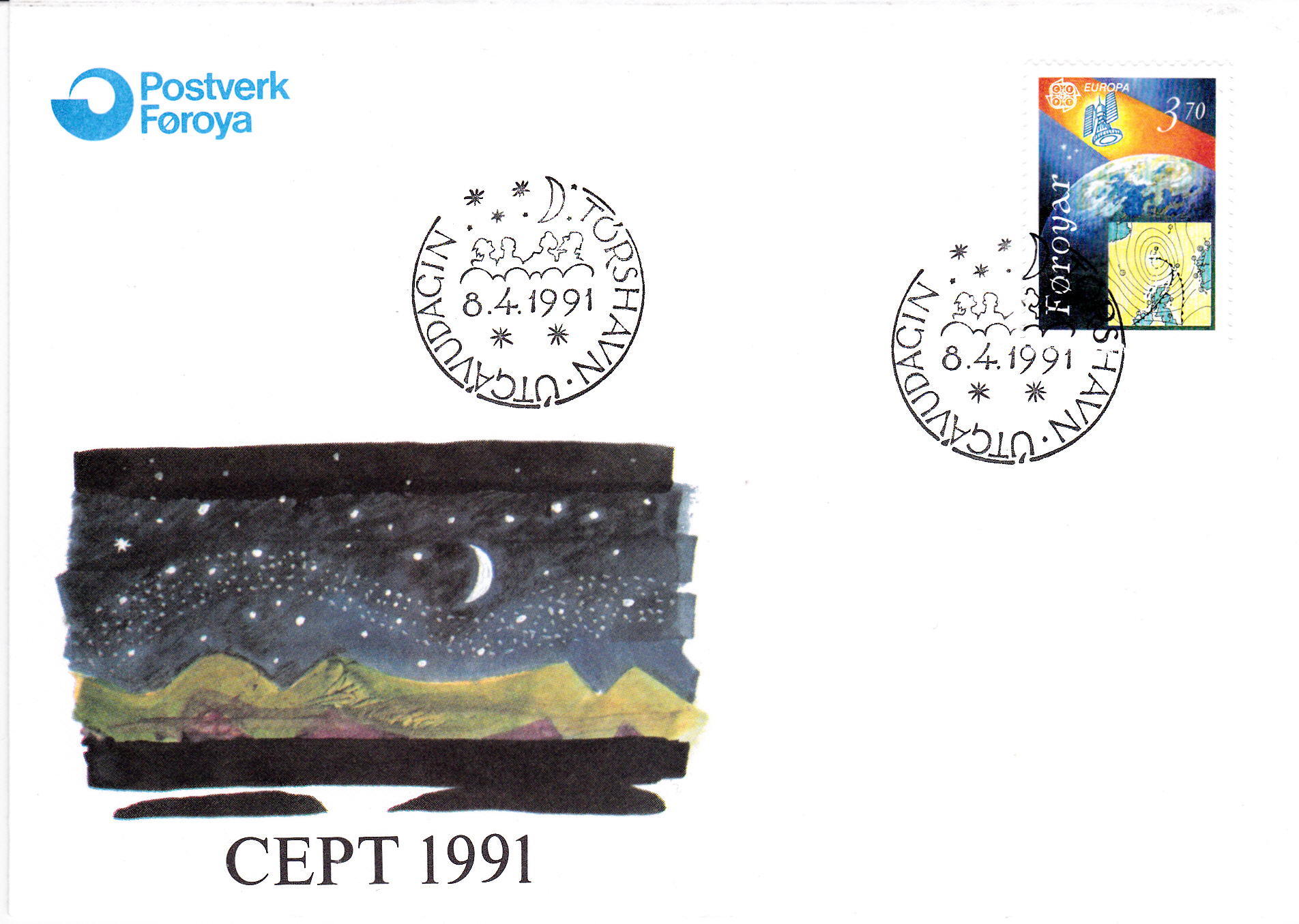 Auf den Färöer-Inseln erschienen die Europamarken 1991 zum Gemeinschaftsthema "Europäische Weltraumfahrt" am 8. April 1991. Hier die Marke zu 3,70 Kronen mit der Abbildung eines Satelliten, der Erde und einer Wetterkarte. Die Auflage betrug 705 000 Stück.
