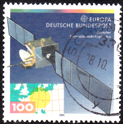 Bei der Deutschen Bundespost sind die Europamarken 1991 zum Gemeinschaftsthema "Europäische Weltraumfahrt" am 2.5.1990 erschienen. Hier die Marke zu 100 Pf mit dem Deutschen Fernmeldesatellit "Kopernikus".