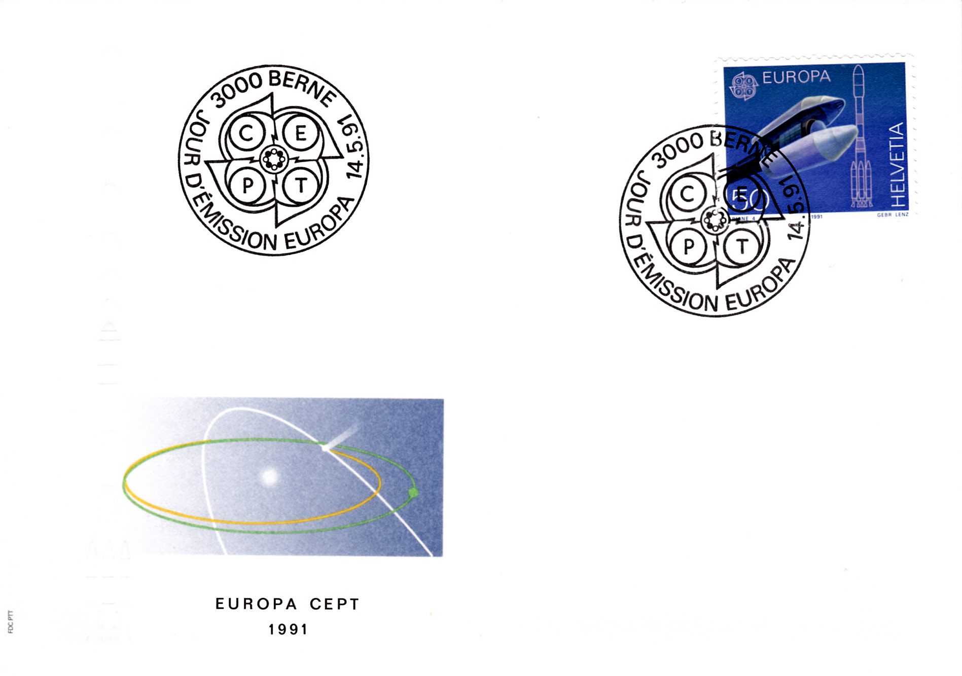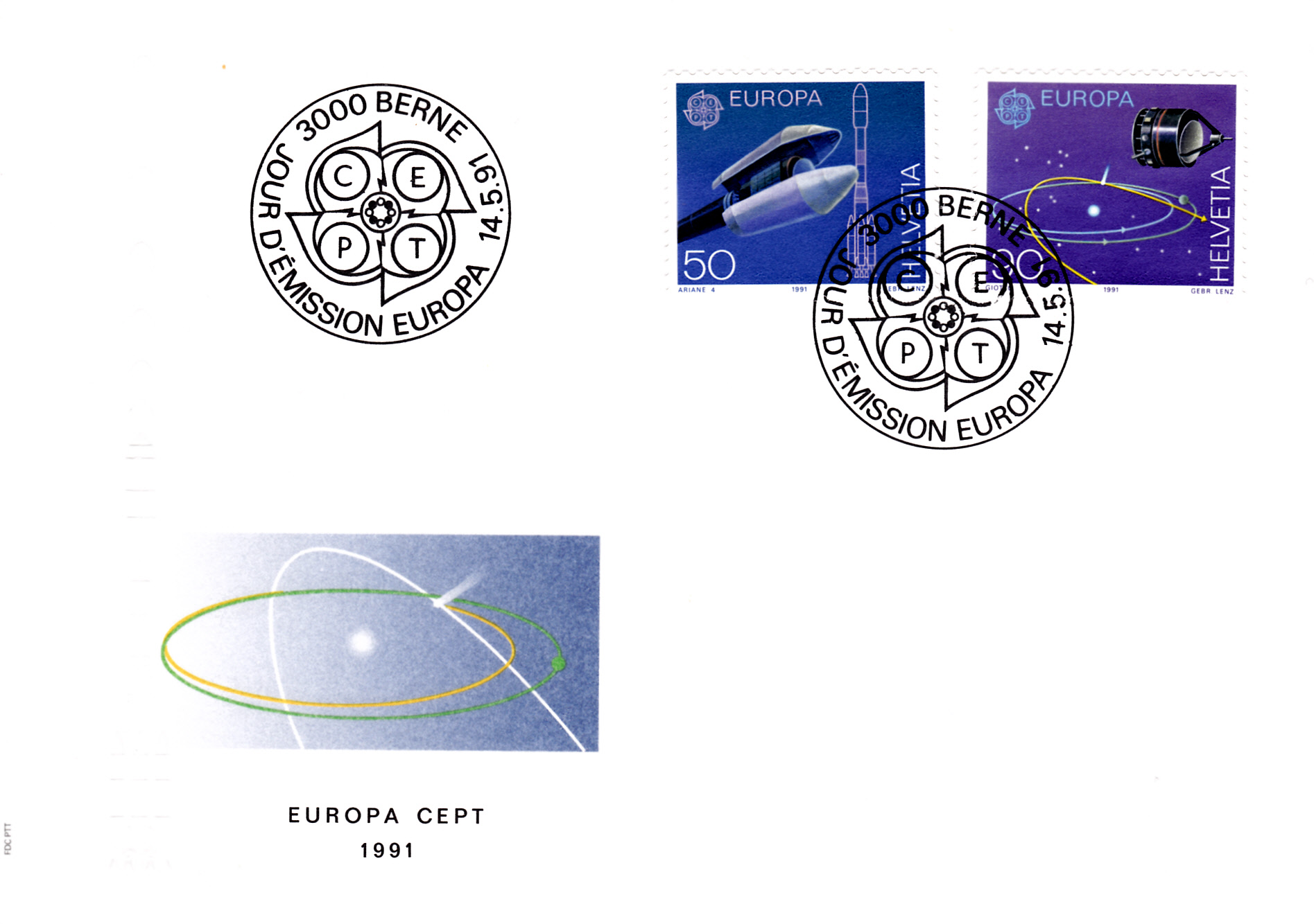 In der Schweiz erschienen die Europamarken 1991 zum Gemeinschaftsthema "Europäische Weltraumfahrt" am 14. Mai 1991. Hier die Marke zu 50 Rappen mit der Abbildung der Nutzlastverkleidung der Trägerrakete "Ariane 4". Die Auflage betrug 24 716 000 Stück.