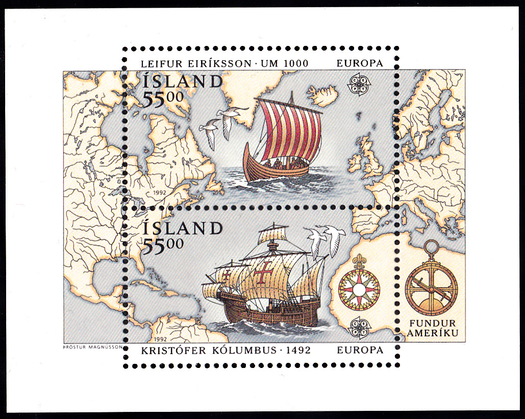 In Island erschienen die Europamarken 1992 zum Gemeinschaftsthema "500. Jahrestag der Entdeckung von Amerika" am 6. April 1992. Hier die Blockausgabe mit zwei Marken zu je 55.00 Kronen (MiNr 764/765) mit Darstellungen des Segelschiffes von Leif Eriksson (um 975-um 1020, Seefahrer) und der "Santa Maria" von Christoph Kolumbus (1451-1506, spanisch-italienischer Seefahrer). Die Auflage des Blockes betrug 500 000 Blocks. Die Einzelmarken (MiNr 762/763) aus Bögen haben im Gegensatz zu den Blockmarken einen weißen Rahmen.