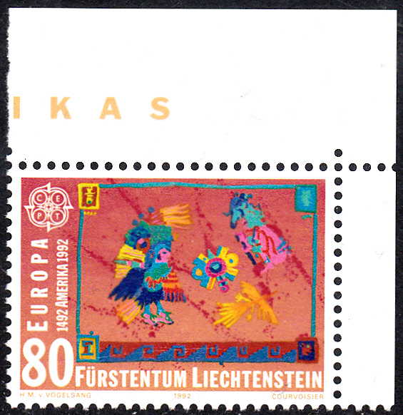 Die Europamarken 1992 aus Liechtenstein zum Gemeinschaftsthema "500. Jahrestag der Entdeckung von Amerika" sind am 2. März 1992 erschienen. Hier ein Eckrandstück der Marke zu 80 Rappen mit einer Abbildung "Altes Amerika". Die Auflage der Marke betrug 897 491 Stück.