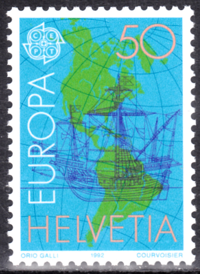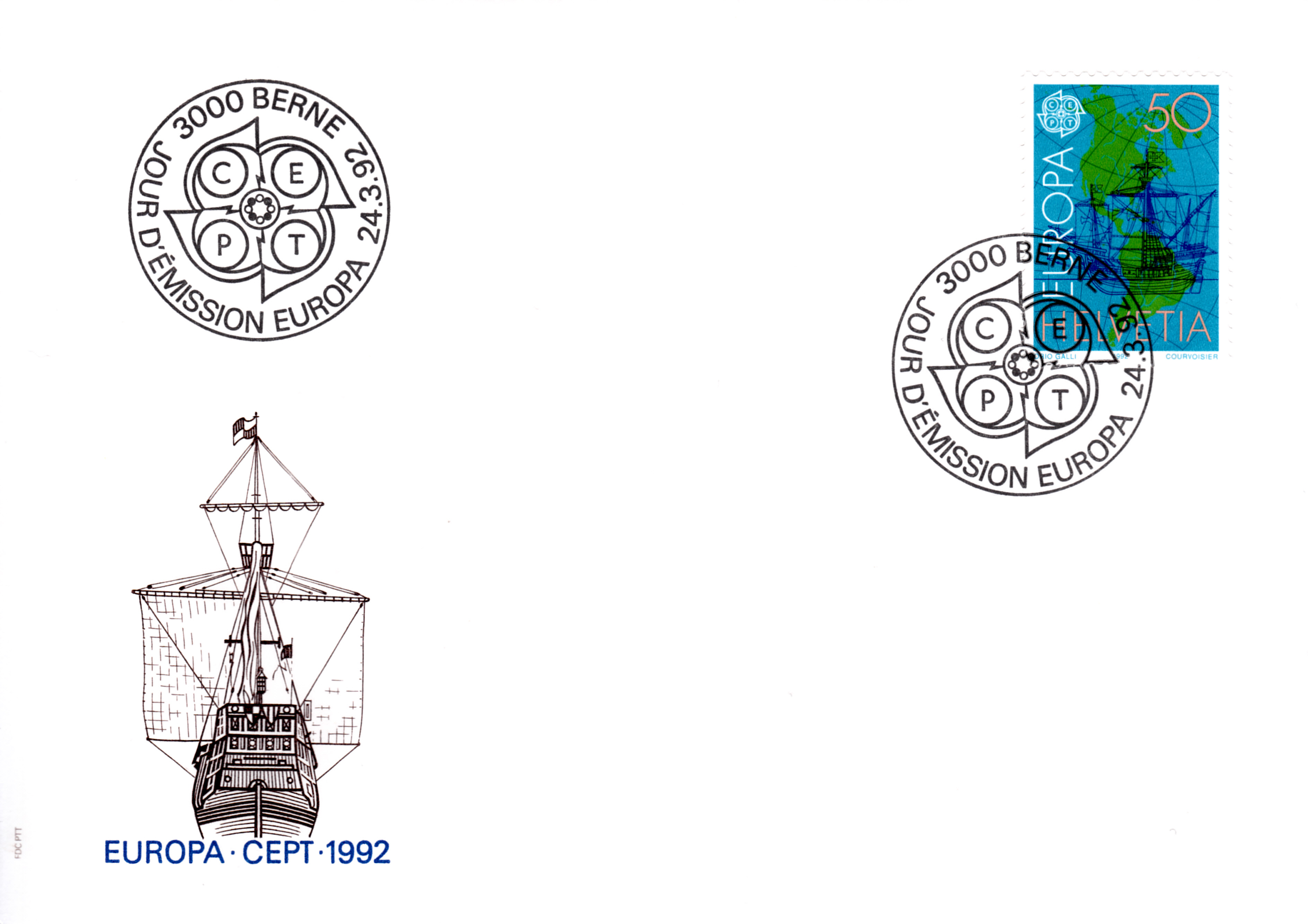 Die Europamarken 1992 aus der Schweiz zum Gemeinschaftsthema "500. Jahrestag der Entdeckung von Amerika" sind am 24. Mätz 1992 erschienen. Hier die Marke zu 50 Rappen mit der Karracke "Santa Maria" und einer Landkarte von Amerika. Die Auflage der Marke betrug 9 394 000 Stück.