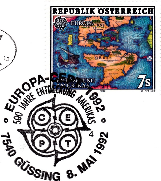 Die Europamarke 1992 aus Österreich zum Gemeinschaftsthema "500. Jahrestag der Entdeckung von Amerika" ist am 8. März 1992 erschienen. Hier diese Marke zu 7 Schilling mit der Abbildung einer Landkarte von Amerika aus dem 16. Jahrhundert. Die Auflage der Marke betrug 3 000 000 Stück.