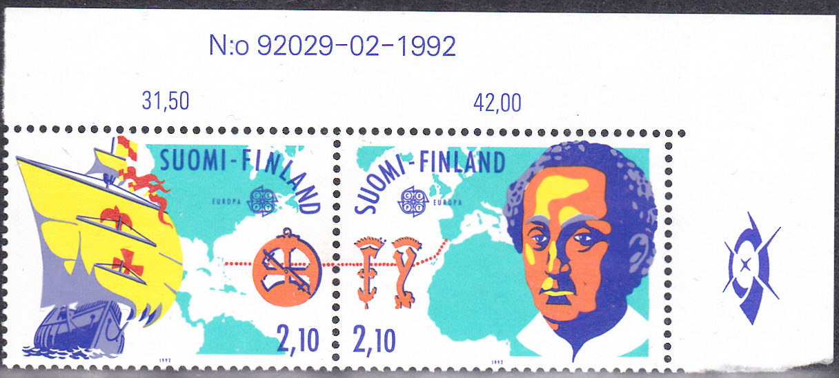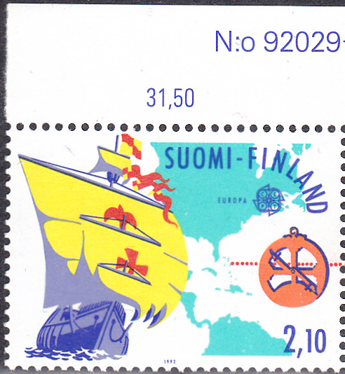 Die Europamarken 1992 aus Finnland zum Gemeinschaftsthema "500. Jahrestag der Entdeckung von Amerika" sind am 8. Mai 1992 erschienen. Hier die Marke zu 2,10 Mark mit der Karracke "Santa Maria" und einer Landkarte mit der Reiseroute. Die Auflage der Marke betrug 4 00 000 Stück.