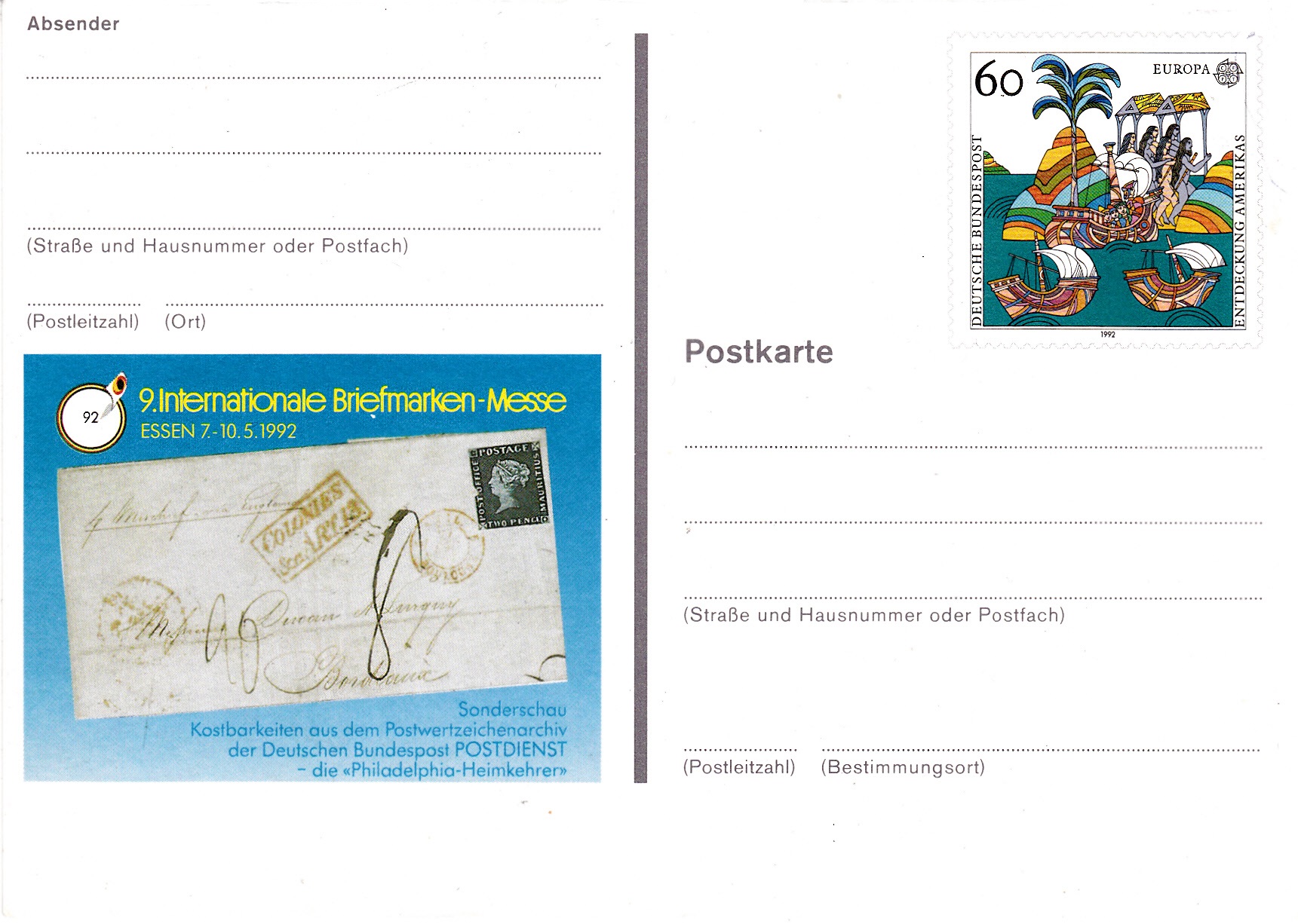 Zur 9. Internationalen Briefmarken-Messe Essen erschien eine Ganzsachenpostkarte mit dem Wertzeicheneindruck der 60Pf Europamarke 1992 (MiNr PSo 27). Hier ein ungebrauchtes Exemplar.