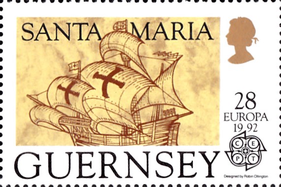 Die Europamarken 1992 aus Guernsey zum Gemeinschaftsthema "500. Jahrestag der Entdeckung von Amerika" sind am 6. Februar 1992 erschienen. Hier die Marke zu 28 Pence mit der Route einer Abbildung des Flaggschiffes "Santa Maria". Die Auflage der Marke betrug 364 684 Stück.