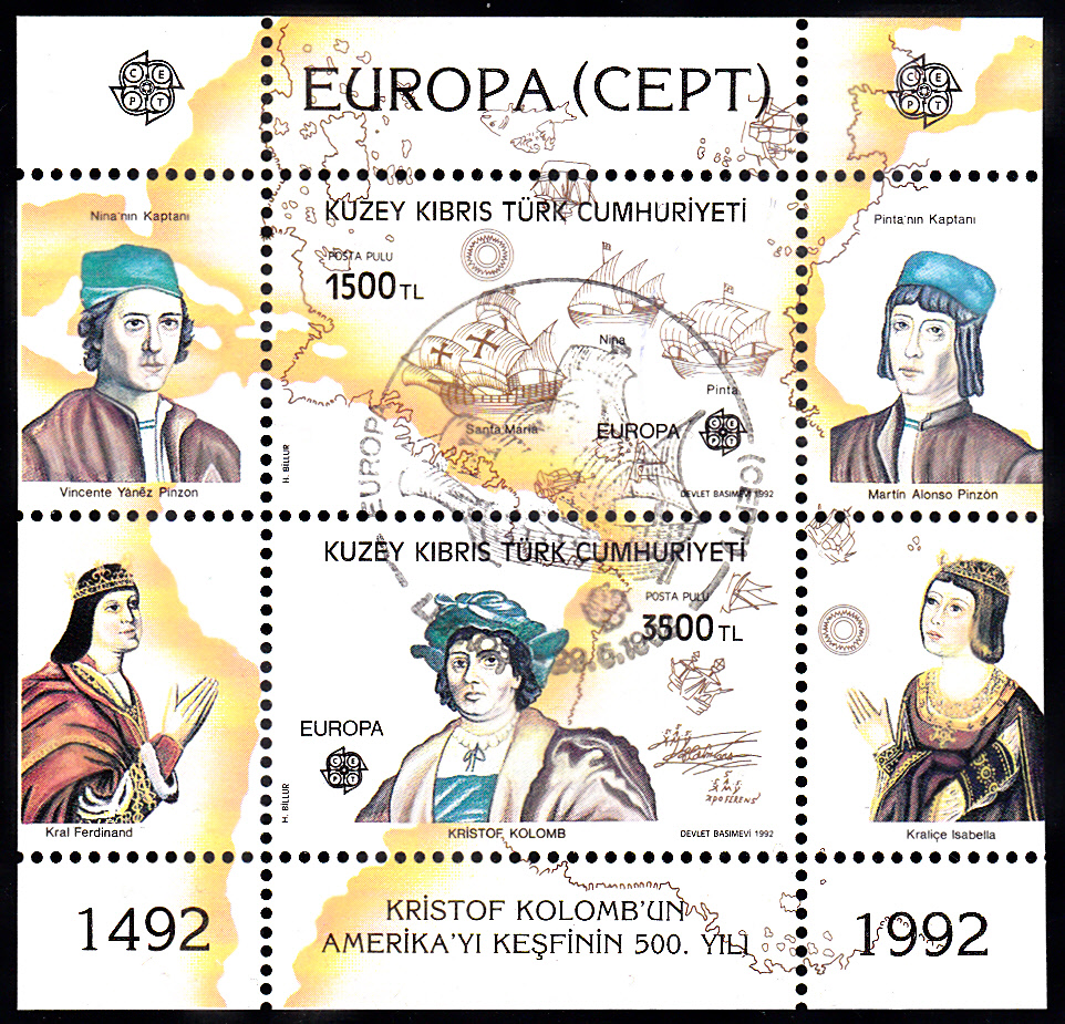 In Türkisch-Zypern erschienen die beiden Europamarken 1992 zum Gemeinschaftsthema "500. Jahrestag der Entdeckung von Amerika" in einem Block am 29. Mai 1992 in einer Auflage von 200 000 Stück. Auf der Marke zu 1500 TL werden die Karracke "Santa Maria" und die Karavellen "Niña" und "Pinta" gezeigt, die Marke zu 3500 TL bildet Christoph Kolumbus ab.