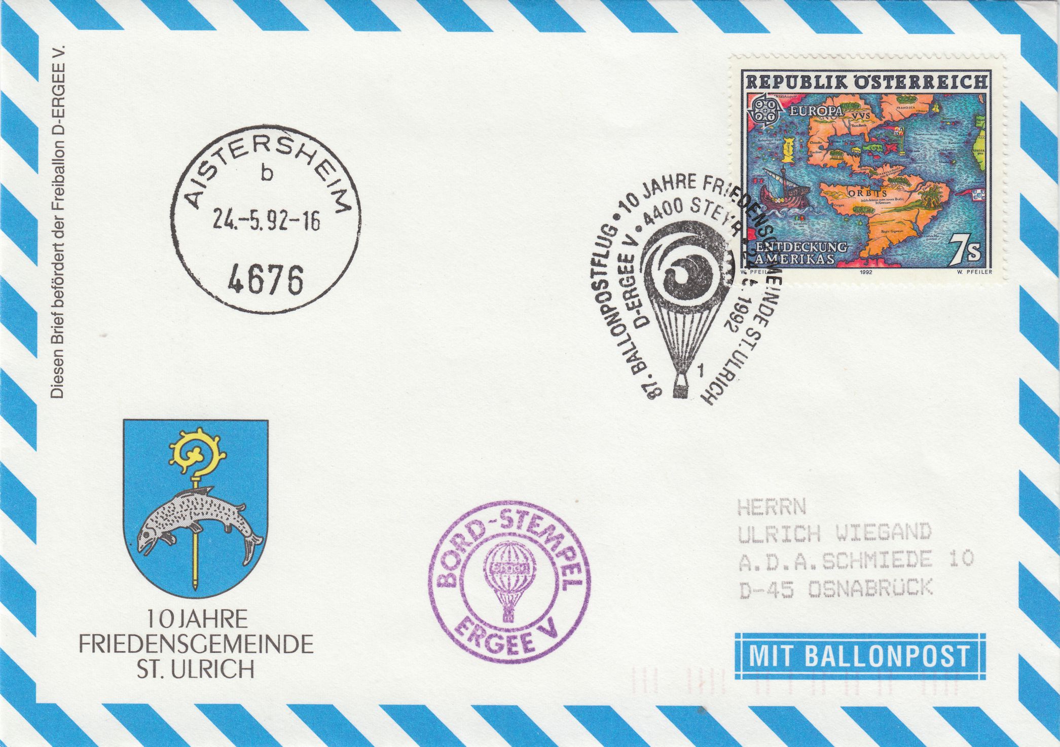 EF der Europamarke 1992 aus Österreich, MiNr. 2062, am 24.05.1992 auf Beleg, befördert mit dem Freiballon "D-ERGEE V":