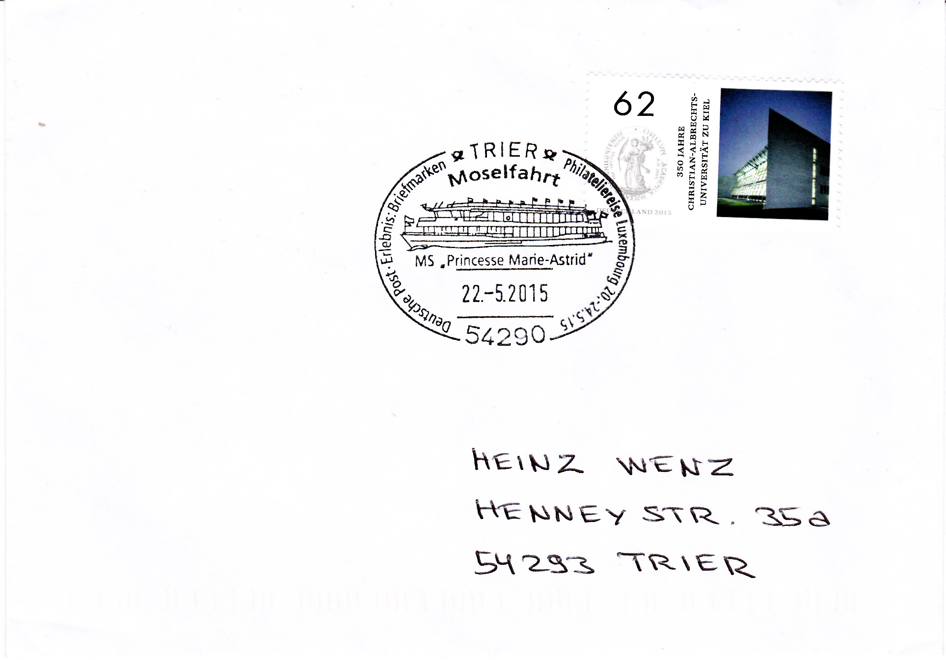 Sonderstempel aus Trier zu einer "Philateliereise nach Luxemburg" mit der MS "Princesse Marie-Astrid" vom 22.5.2015. Im Stempelbild ist das Schiff abgebildet.