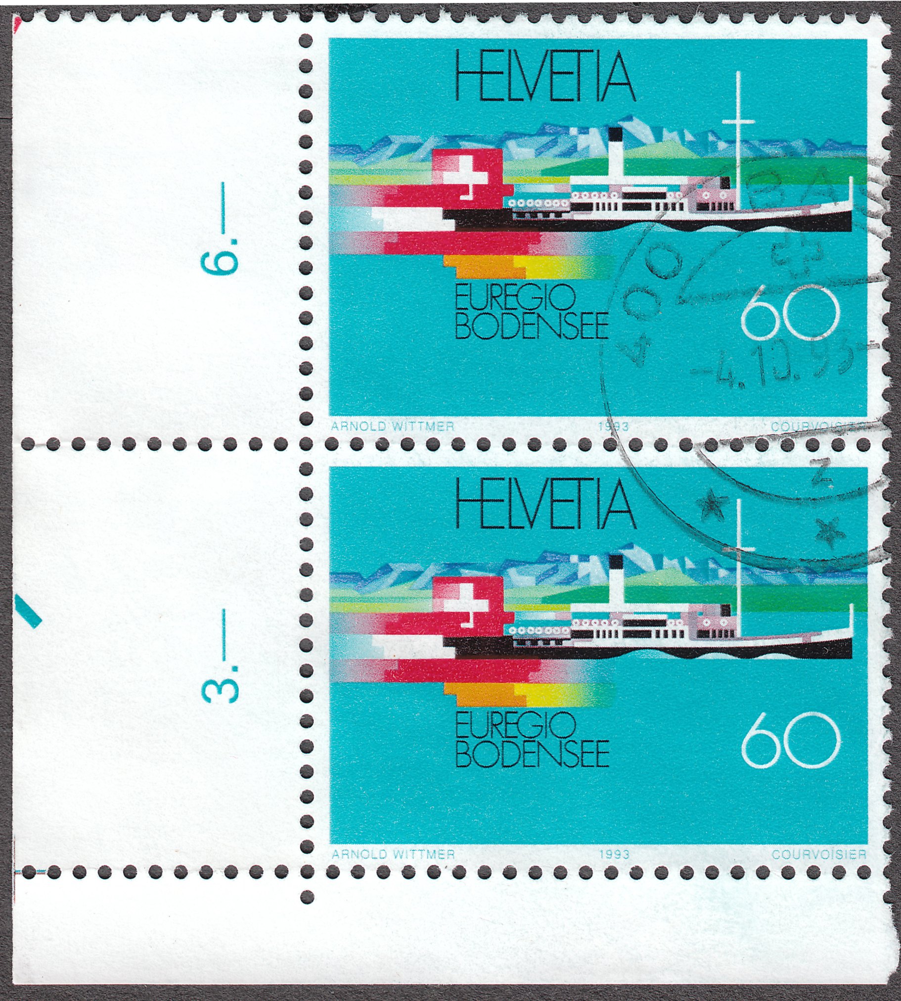 Dieses Postwertzeichen aus der Schweiz, hier als senkrechtes Paar vom Eckrand 3, zeigt als Motiv den Seitenraddampfer HOHENTWIEL, gebaut 1913 von Escher Wyß & Cie, Zürich, 950 PS, Ölfeuerung, 700 Personen: